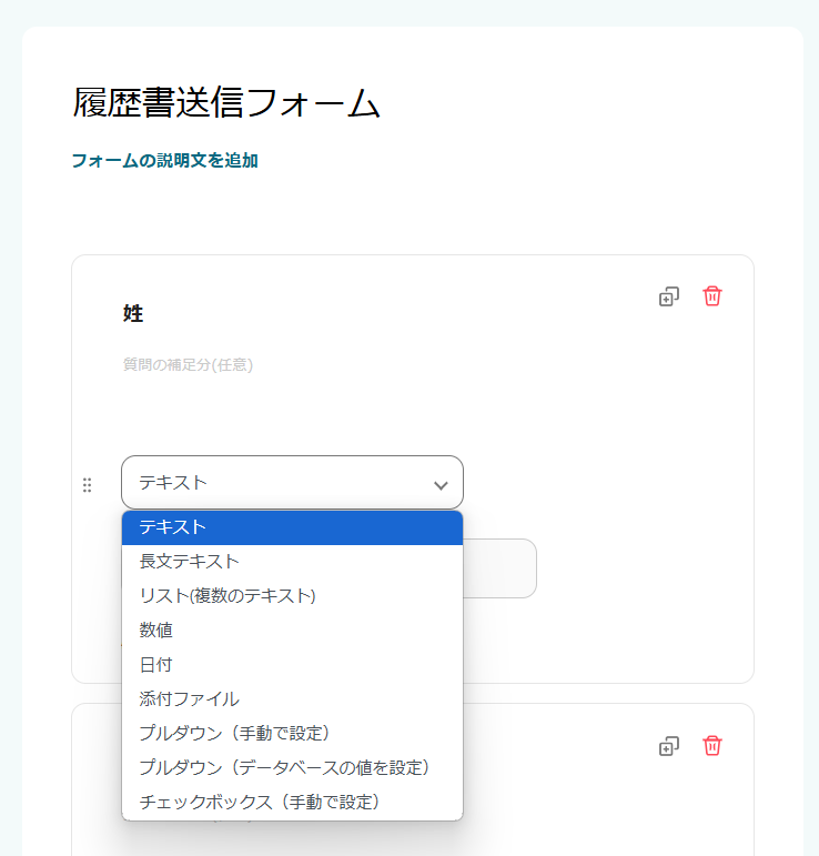 入力方法はテキスト以外にも、リストや数値・日付などがあるので履歴書の添付以外で必要な情報を入力できるように設定しましょう。