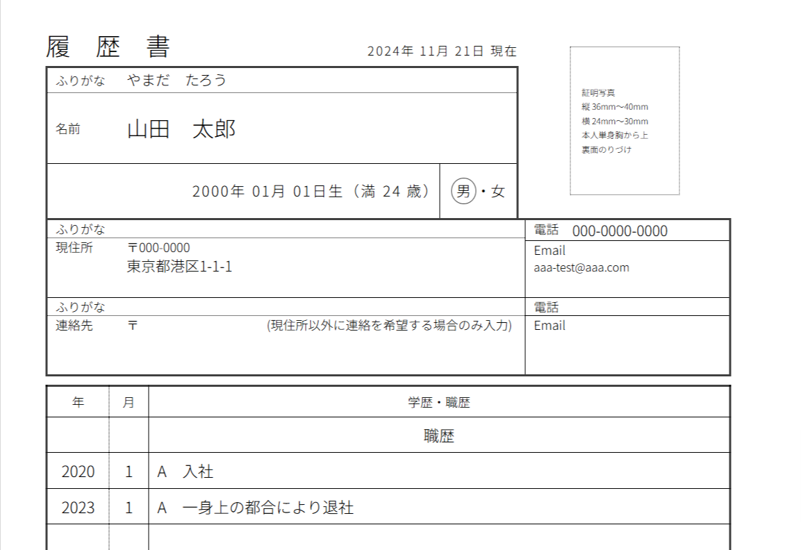 テスト用なので、履歴書の内容は仮で問題ありません。