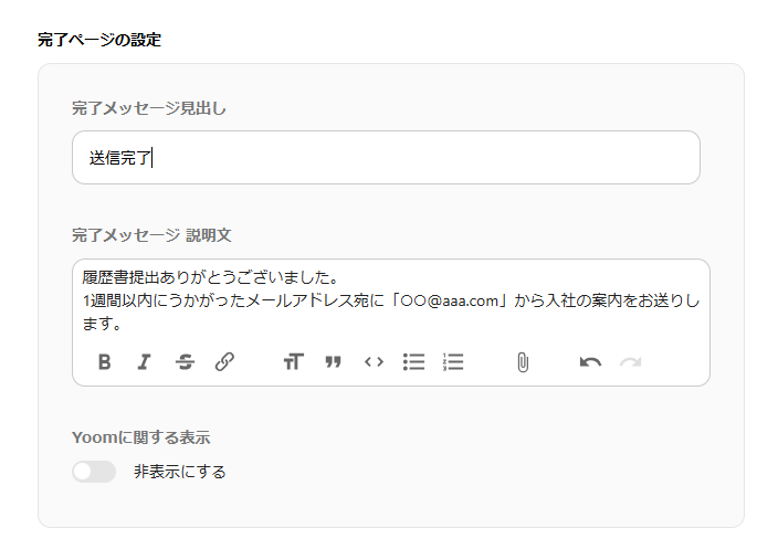 フォーム送信後の完了ページに表示させるメッセージに設定もできます。