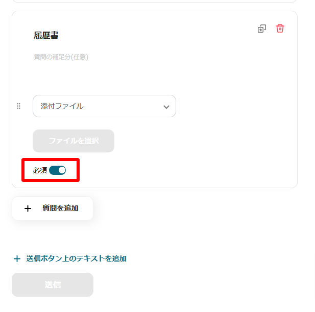 履歴書の添付などの必須項目は各項目の下のトグルをONにしておいてください。