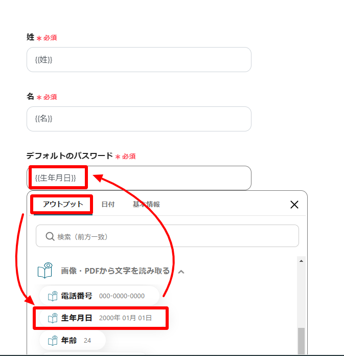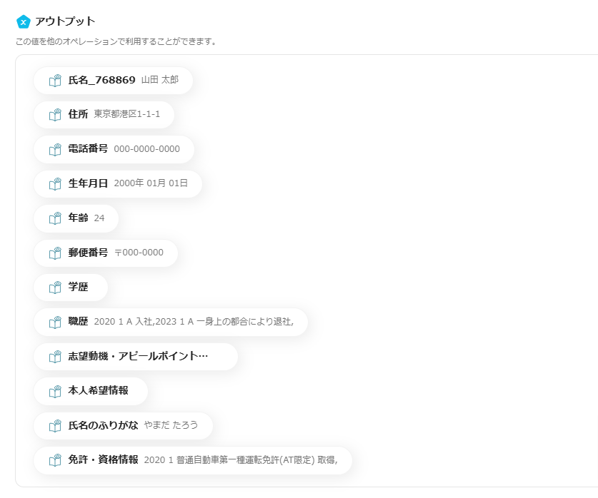 読み取る履歴書の内容によって、アウトプットの値は流動的に変化します。