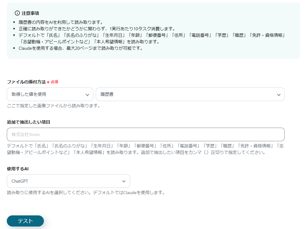 履歴書からデフォルトの項目以外で抽出したい項目がある場合は、ここで設定しておきましょう。