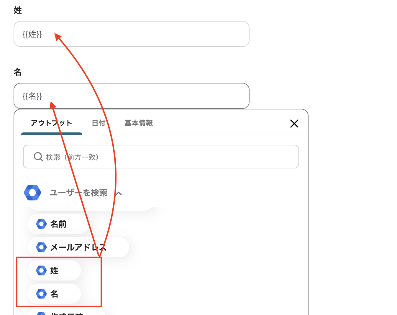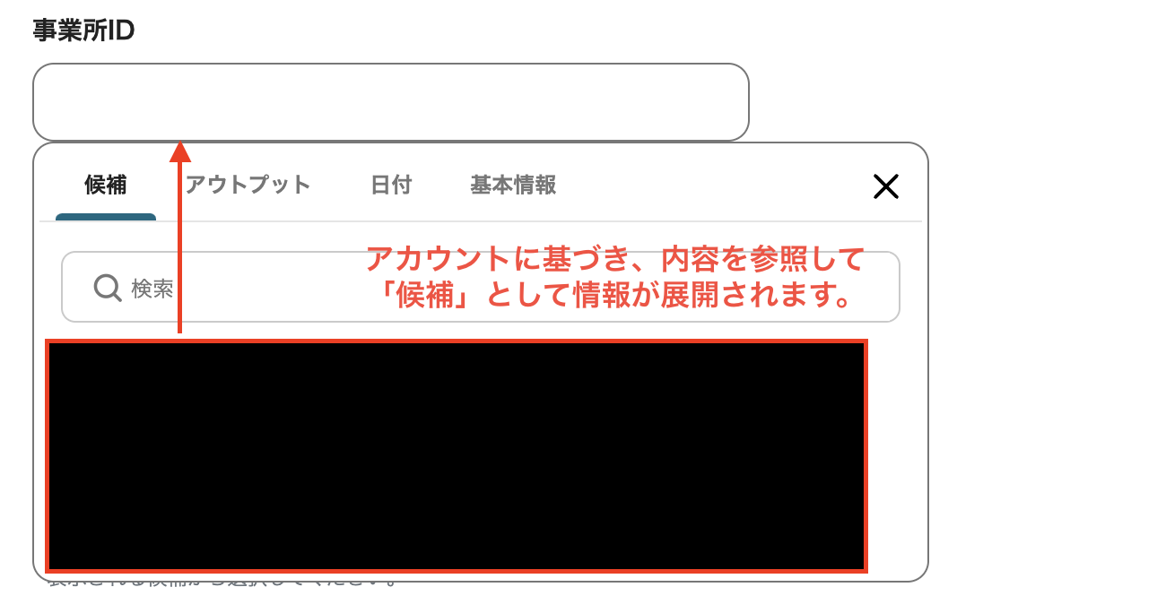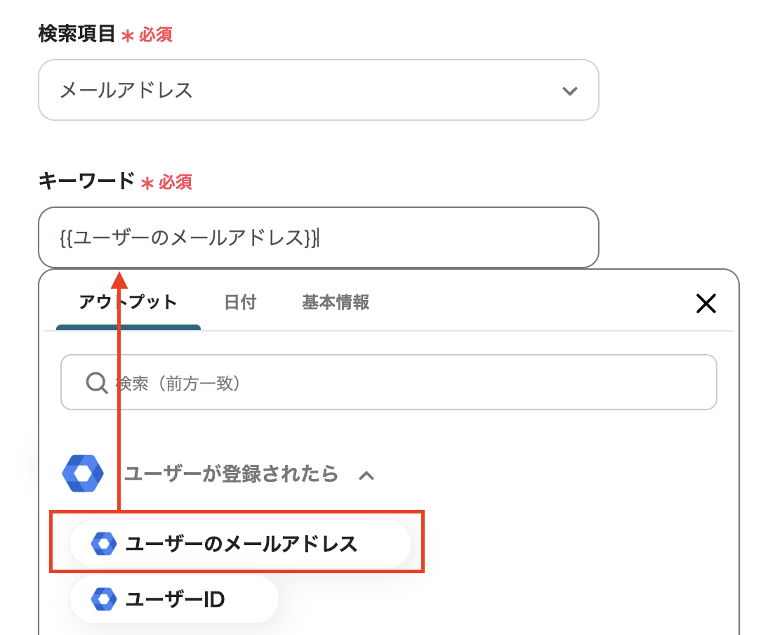(8)「キーワード」の項目で入力バーをクリックすると、以下の画面のように前ステップで取得した情報をアウトプットとして引用できます。