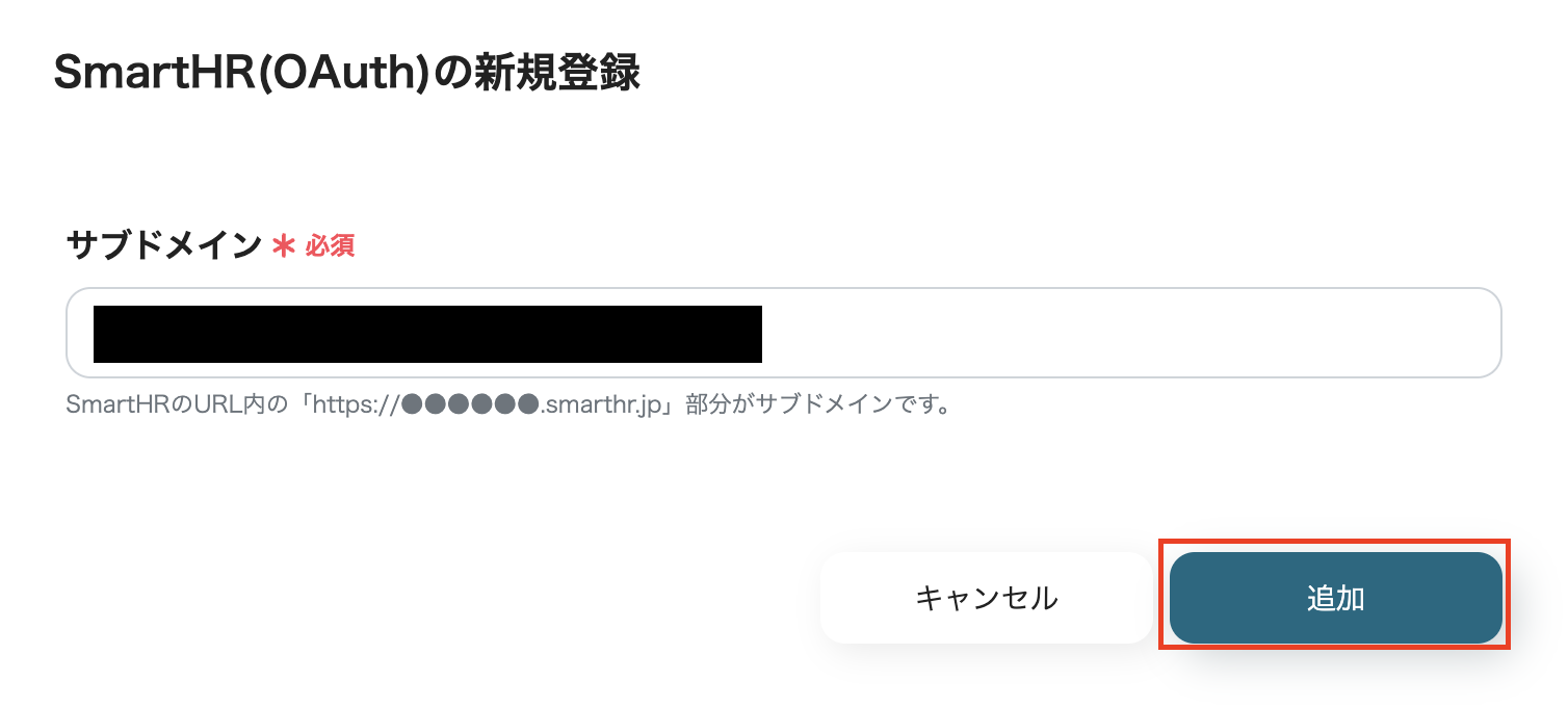 (6)連携するSmartHR(OAuth)の「サブドメイン」を入力し、[追加]をクリックします。