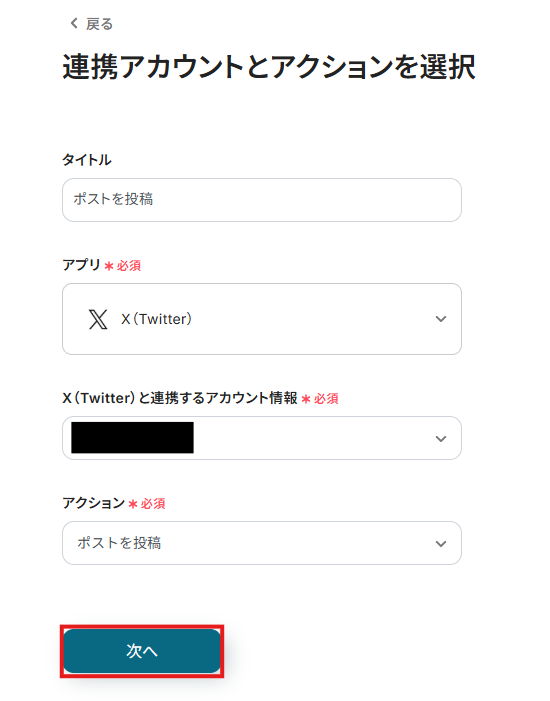 1.アプリと連携する「ポストを投稿 」をクリックしてください。 表示された画面で必須項目を入力し、「次へ」をクリックします。