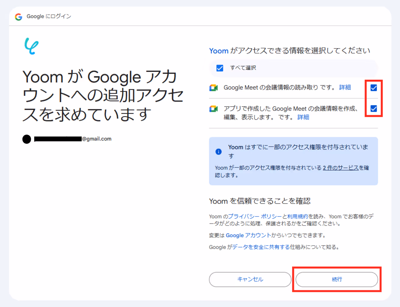両方のチェックボックスにチェックを入れ「続行」をクリックするとGoogle Meetのマイアプリ連携が完了します。