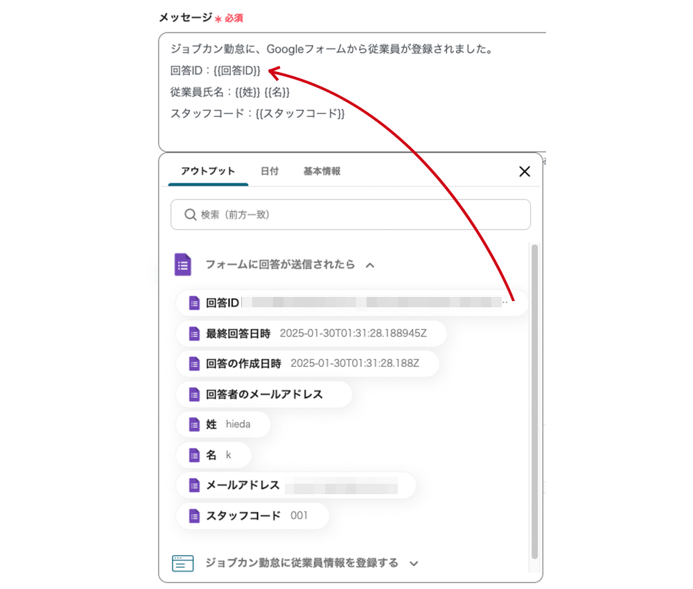 - アクションの操作画面が表示されます。値の欄をクリックすると、Google フォームから取得した項目が表示されるので、選択すると引用コードが埋め込まれます。