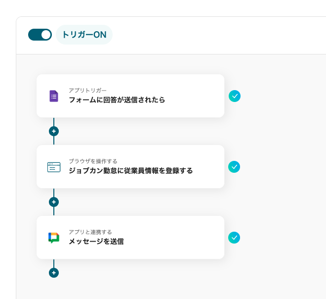 「新しいスタッフの情報を登録するとき、同じ作業の繰り返しでミスが起こりそう…」この記事では、そんな悩みを解決するジョブカン勤怠の新規スタッフ登録を自動化するフローをご紹介しました。さらに、GoogleフォームとGoogle Chatを連携すれば、情報の取得からチームへの共有までワンストップで完結。これにより、人事担当者や総務の負担が軽減され、もっと人の手が必要な業務に時間を使えるようになります。「まずは試してみたい!」と思った方は、Yoomのフローボットテンプレートをぜひお試しください。 プログラミングの知識は不要で、直感的な操作ですぐに設定できます。無料トライアルは下のバナーから。自動化で、もっとスマートな働き方を体験してみませんか?
