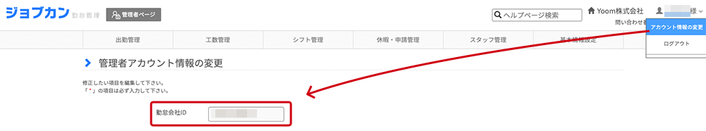 - ジョブカン勤怠の管理画面右上にあるユーザー名をクリックしてメニューを開き、その後『アカウント情報の変更』をクリックすると、勤怠会社IDが表示されますので、それをメモしておきましょう。
