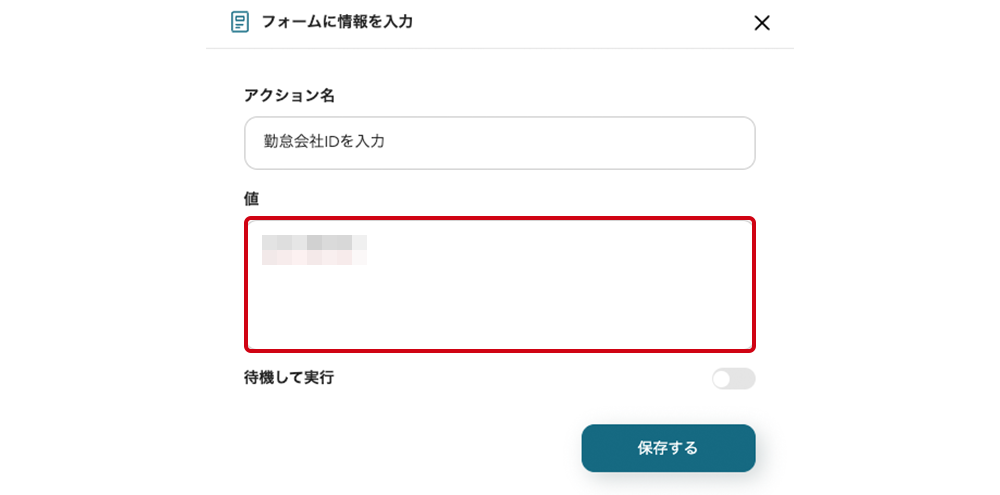 「2.勤怠会社IDを入力」をクリックすると下の入力画面が表示されます。値の欄に、事前に取得しておいた値を入力して保存するをクリックしましょう。