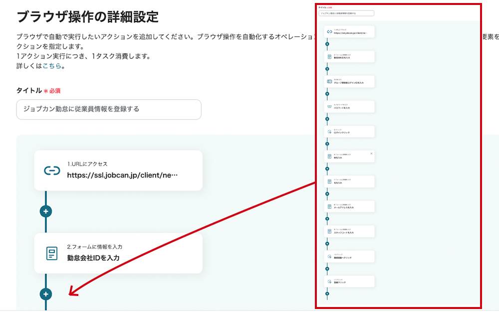 - 2つ目以降のアクションは、下へスクロールすると確認できます。まずはジョブカン勤怠にログインします。