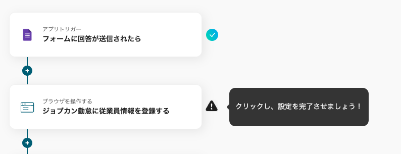 事前設定でジョブカンの管理画面にアクセスから、Google フォームで取得した従業員情報の入力・登録まで雛形が設定されています。この工程は、Webサイト上でスタッフ登録をする工程を辿っています。