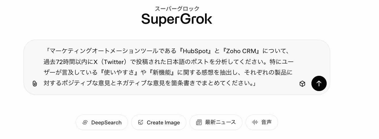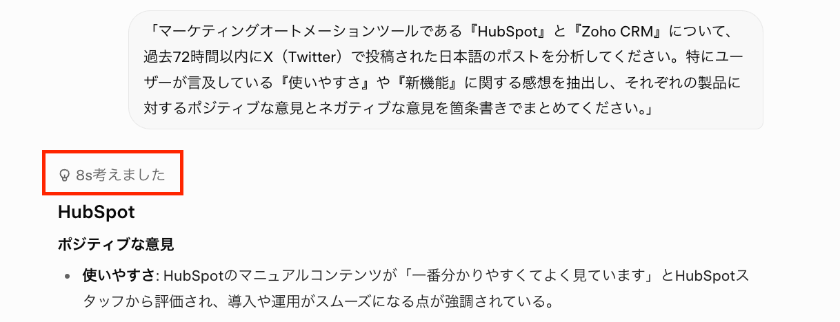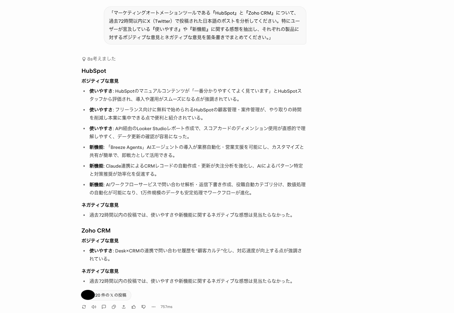 「マーケティングオートメーションツールである『HubSpot』と『Zoho CRM』について、過去72時間以内にX(Twitter)で投稿された日本語のポストを分析してください。特にユーザーが言及している『使いやすさ』や『新機能』に関する感想を抽出し、それぞれの製品に対するポジティブな意見とネガティブな意見を箇条書きでまとめてください。」