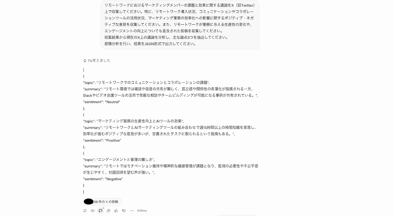 今回は、マーケティングチームの責任者がリモートワークを導入するにあたって、その効果と一般的な意見をXで調査することを想定します。