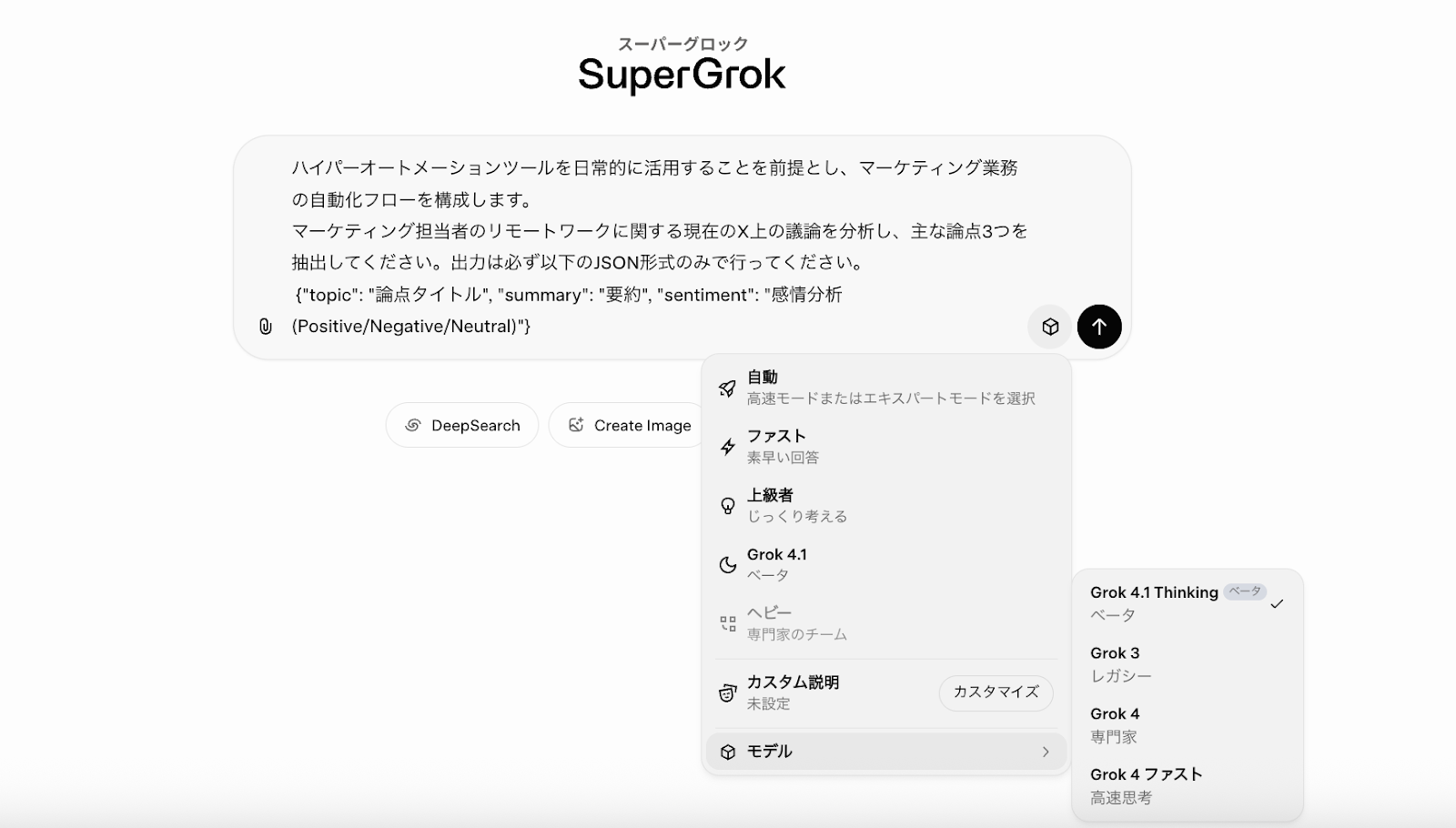 例えば、「毎日決まった時間にGrokが自動で競合調査を行い、その結果をSlackに通知し、Google スプレッドシートに記録する」といったフローを構築できれば、情報収集は完全に自動化されます。