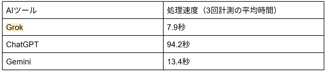 【各AIの処理速度結果】