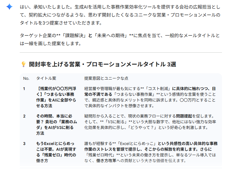 プロンプト あなたは「生成AIを使用して事務作業を楽にするツールを提供している会社の広報担当」です。 契約を広げるために、各企業に送る営業・プロモーションメールのタイトルを3つ提案してください。 思わずメールを開いてしまうようなユニークな提案を行うこと。