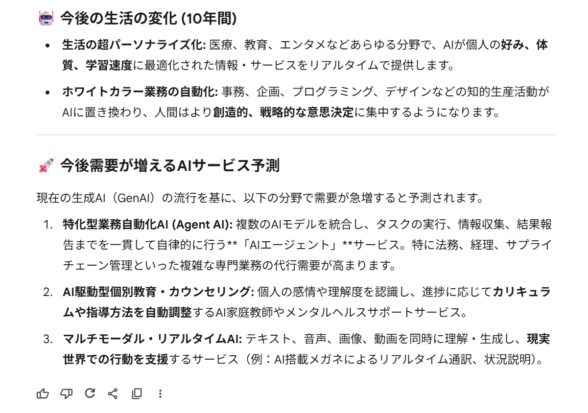 最後にGeminiは、「超パーソナライズ化」と「業務の自動化」という大きなテーマを基に描き出しています 。個人最適化された教育や医療、リアルタイムに世界とつながるマルチモーダルAIなど、高度に統合された知的社会のビジョンを提示しており、3者の中で最も未来指向的な想像力を感じさせます。