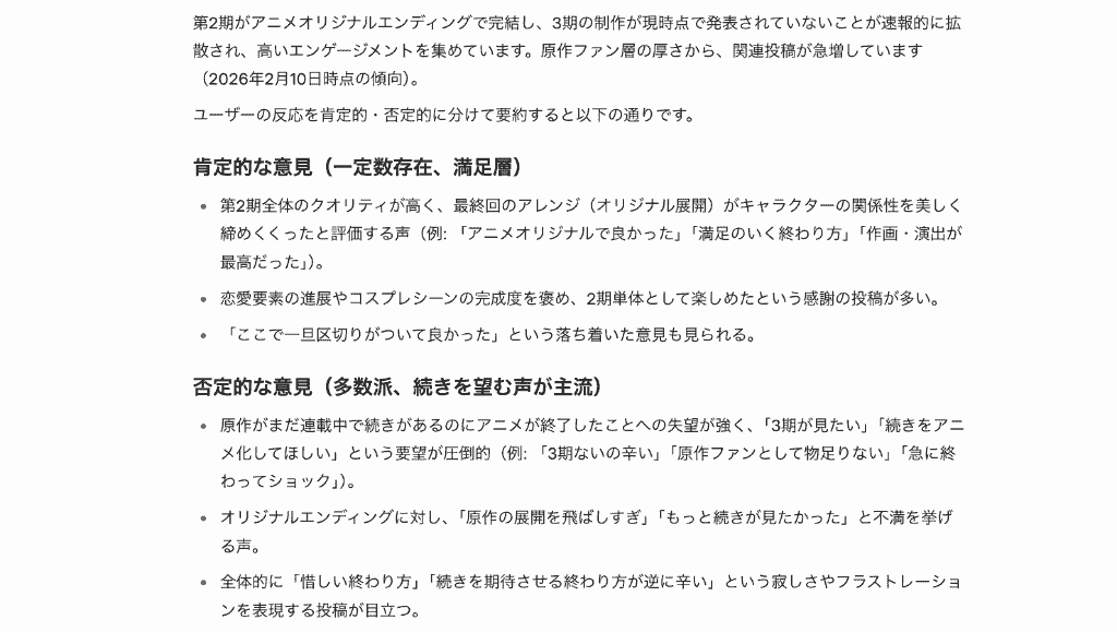 ソースを確認する限り、注目アニメに関する一般的なニュース記事だけでなく、X上の実際のユーザーの声を拾い上げて回答してくれていました。