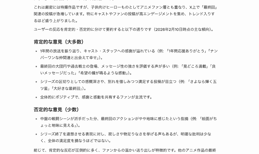 何故特撮?と思ったのですが、『最新の情報を』と指示していたので、その指示を鑑みて直近の「最終回を迎えたアニメ関連のもの」を対象として、WebやSNSを参照したんだと推察します。