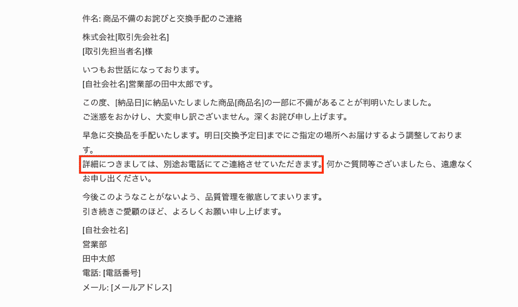 件名は「商品不備のお詫びと交換手配のご連絡」となっており、受信先の人間が一目でどんな要件なのかがわかる構成になっていますね。