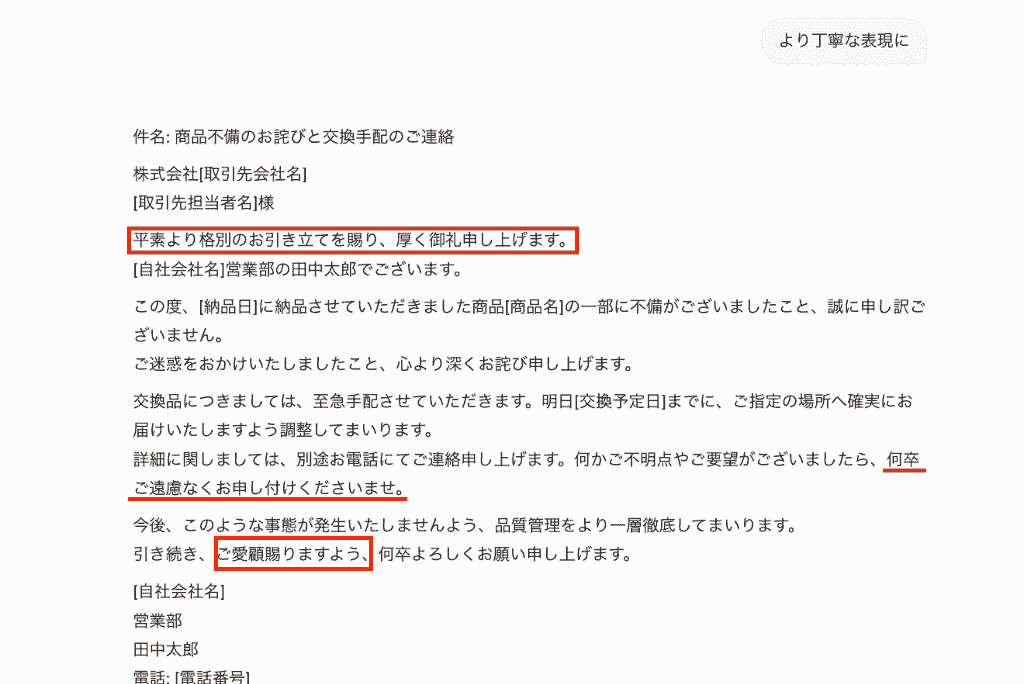プロンプトでは指示していないのですが、電話対応で説明することを補足することで、取引先会社からみても担当者の真摯な姿勢を感じさせるでしょう。