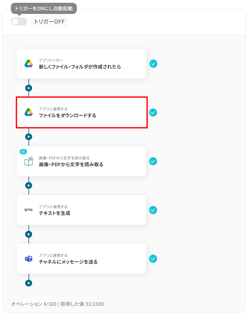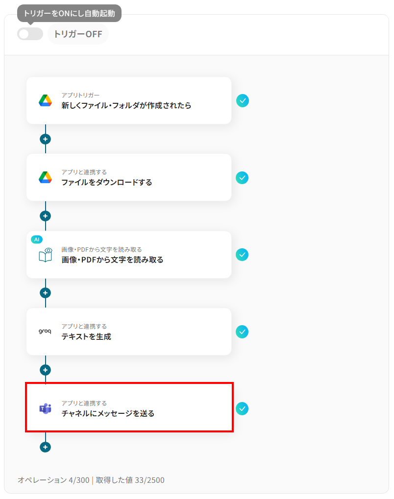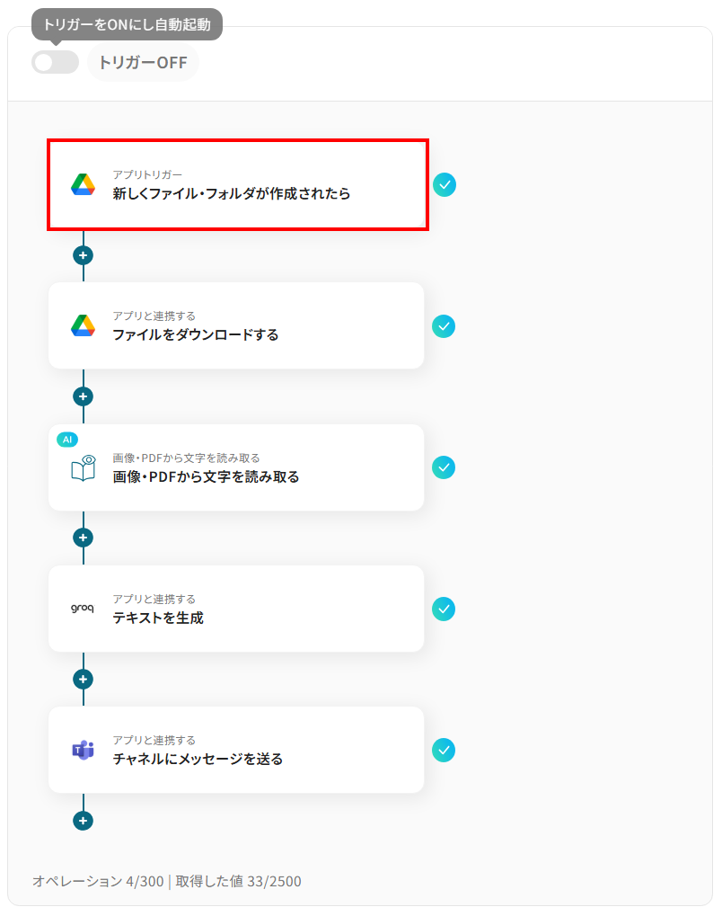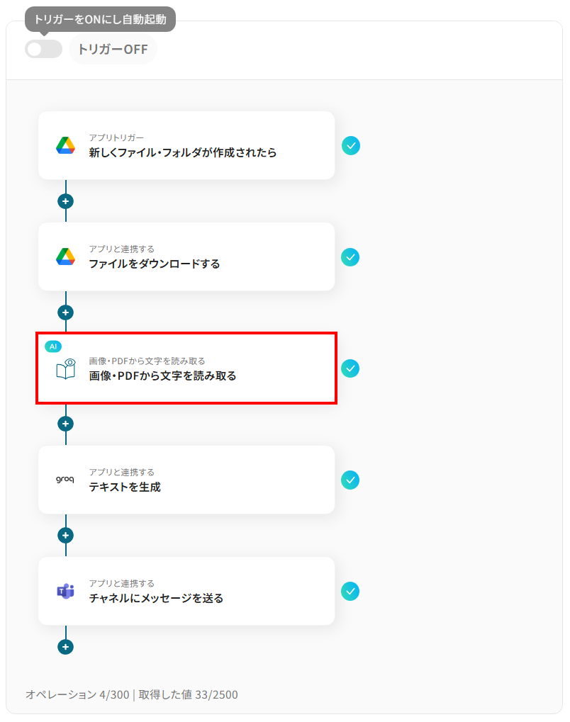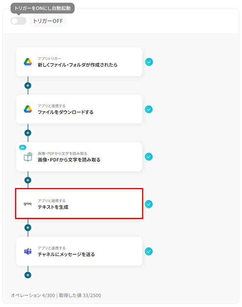 - Google Driveのトリガー設定、AIによる文字の読み取り設定、GroqとMicrosoft Teamsのアクション設定