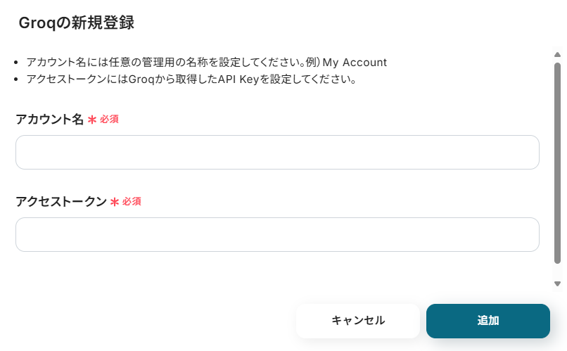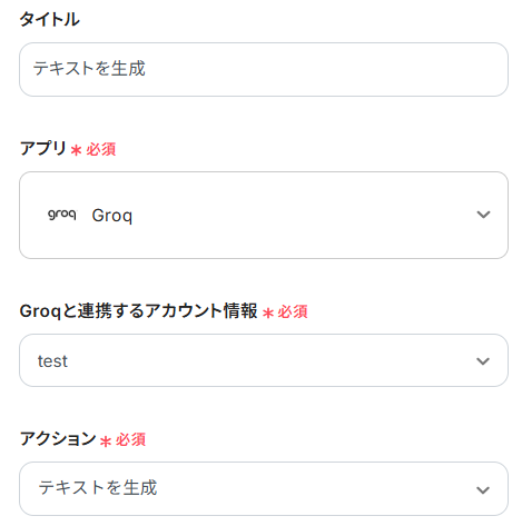 3.ここでは、Groqの具体的な設定をします。下記を参考にそれぞれの項目を入力してください。