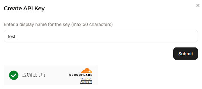 APIキーの表示名を入力し「Submit」を選択してください。すると、APIキーが発行されるのでコピーして、Yoom画面のアクセストークンへ貼り付けしましょう。
