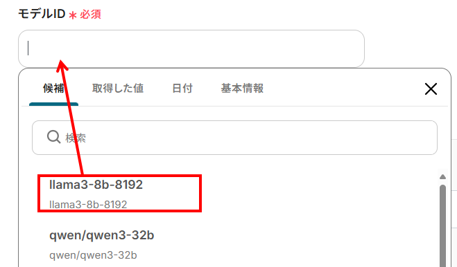 - モデルID:入力欄をクリックすると下記のように候補が表示されます。お好きなモデルIDを選択してください。