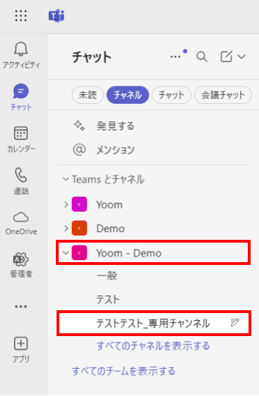 今回は、下記のようなチームとチャネルを準備しました。