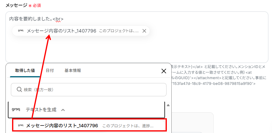 - メッセージ:こちらも入力欄をクリックするとアウトプットが表示されます。Microsoft Teamsに投稿したい内容を、アウトプットを活用して入力してください。
