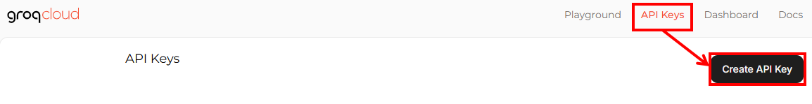 「アクセストークン」は、Groqの公式サイトにログインし、下記赤枠の通りAPI Keys→Create API Keyを選択します。
