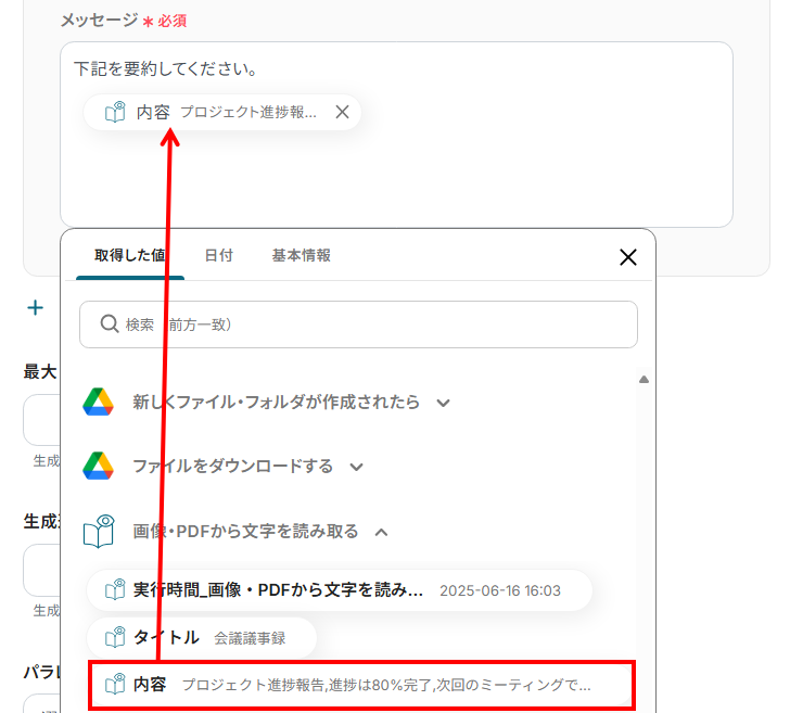 例えば、Google Driveに保存された報告書を読み取ってその要約を自動生成し、関係者に通知するといった一連の作業を効率化できます。