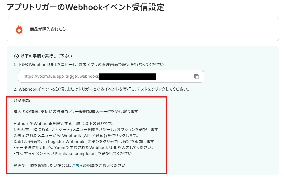 3.表示された画面でURLをコピーして、赤枠を参考にHotmartの管理画面で設定を行なってください。