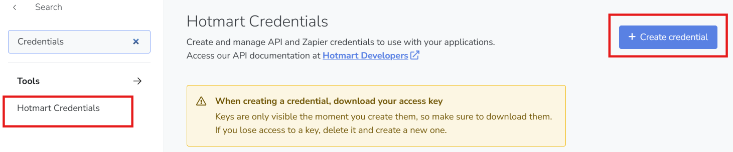 1.Hotmartにログインし、ホーム画面の検索ボックスで「Credentials」と検索し、検索結果の「Create credentials」をクリックしましょう。