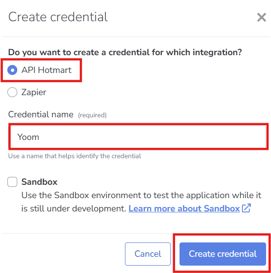 2.以下の画面で「API Hotmart」にマークを入れ、「Credential name」を入力して「Create credentials」をクリックします。