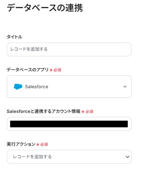 先ほどと同様にタイトルと連携するアカウント情報を任意で設定し、アクションはテンプレート通りに「レコードを追加する」のまま、下にスクロールしましょう。