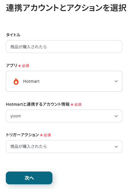 タイトルと連携するアカウント情報を任意で設定し、トリガーアクションはテンプレート通りに「リード情報が作成されたら」のまま「次へ」をクリックして進んでください。