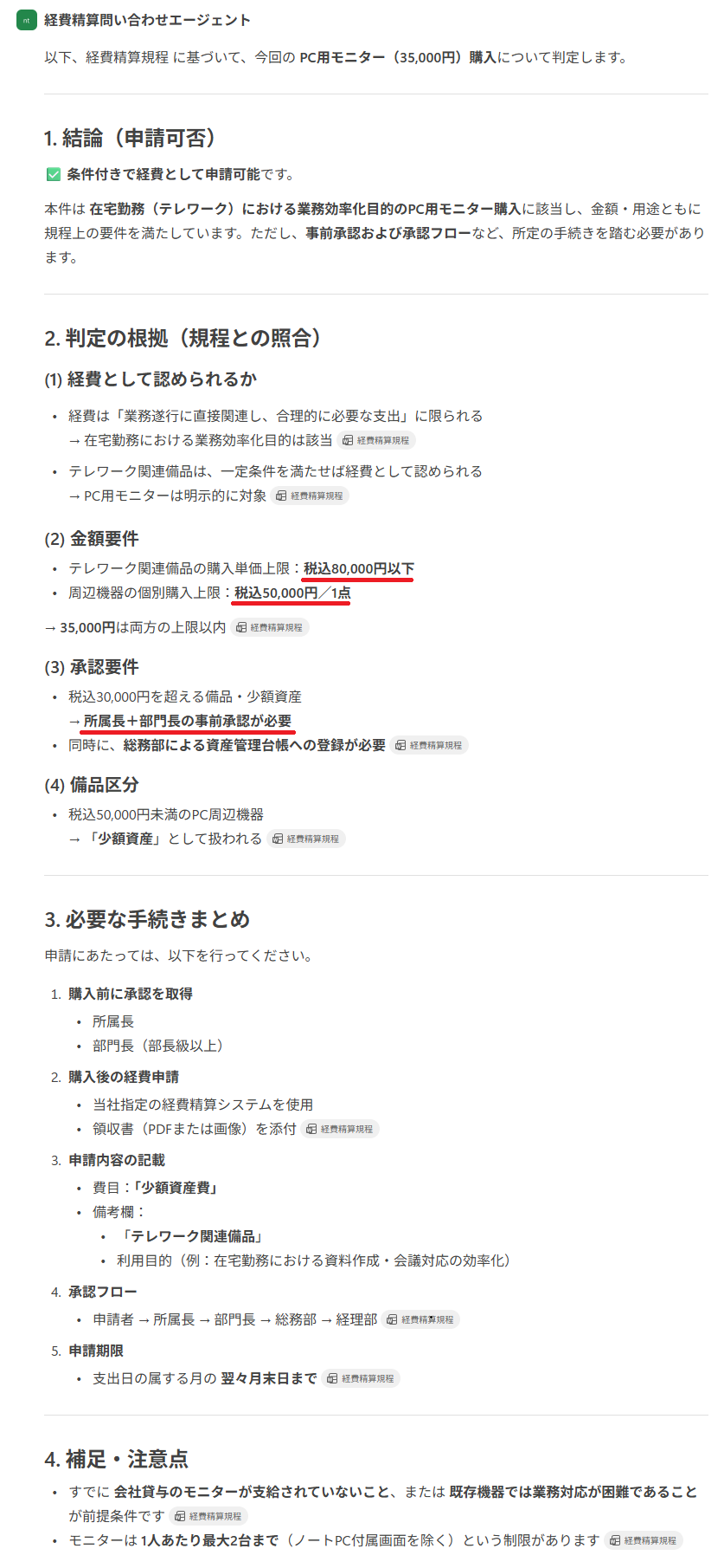 - 指定した社内規程ファイルを参照し、経費対象となる情報を高い精度で抽出・回答できる