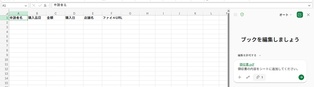 Excelを開き、SharePointに保存した上記のPDFを添付し、以下のプロンプトを送信しました。