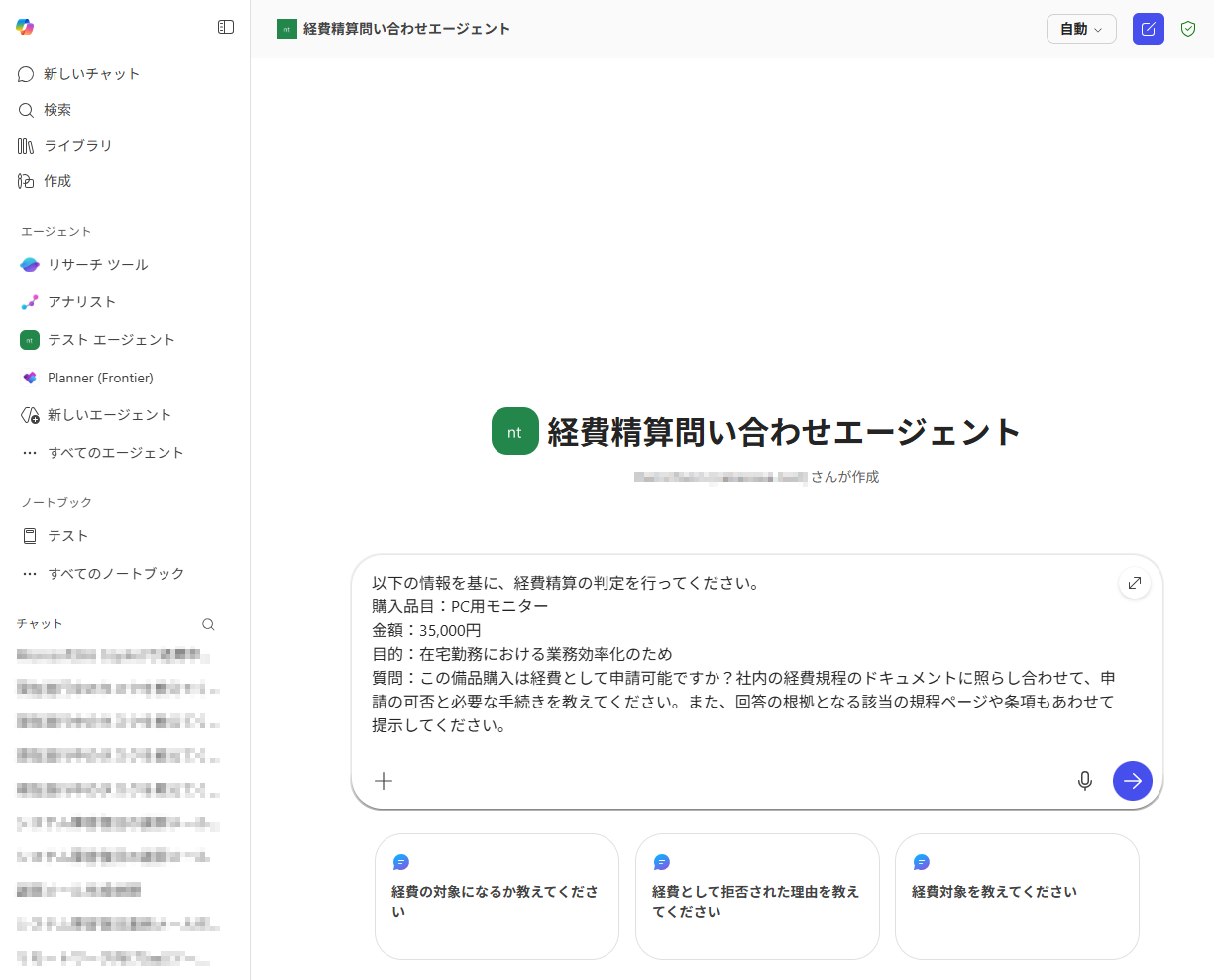 検証2:SharePointの社内規程をもとに経費対象を判定するエージェント作成