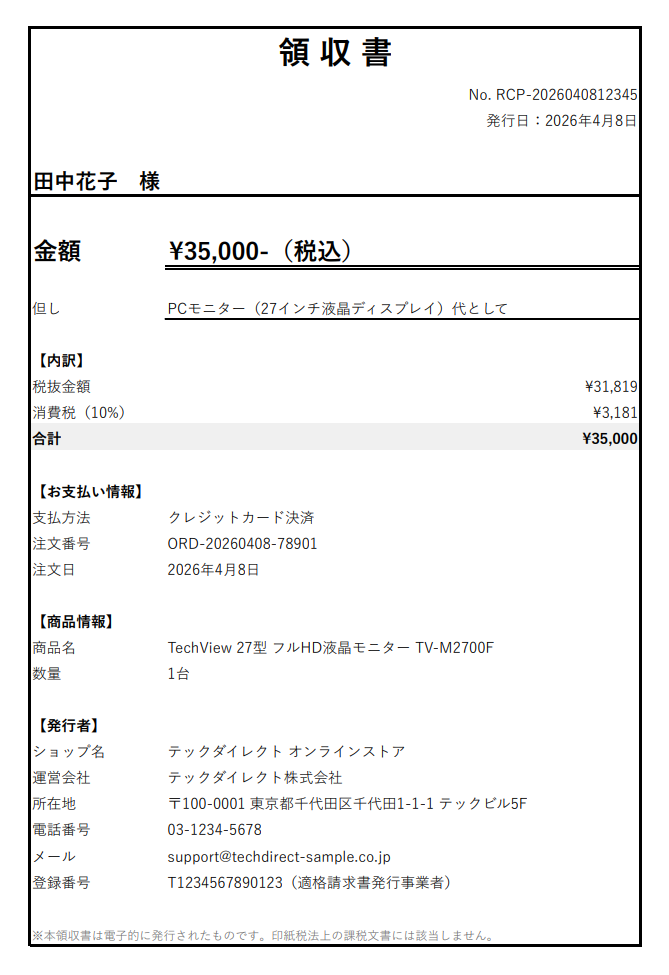 まずは、SharePointに保存した領収書をExcelに記録する業務を試してみました。事前に、以下の架空の領収書を保存しておきました。