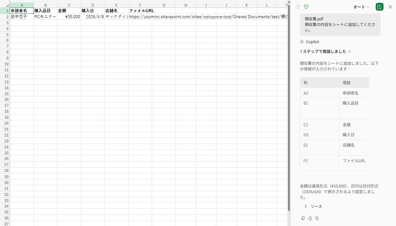 Excel上でCopilotを活用した検証では、PDFの領収書を正確に読み取り、指定のシートへ自動で記録できることが確認できました。これまで経理担当者や申請者が手作業で行っていたテキスト化とデータ入力という2つの工程が同時に完結するため、転記の手間やヒューマンエラーを削減できます。特に、オンラインで発行された電子領収書をExcelベースで管理している企業にとっては、劇的な業務の効率化が期待できます。