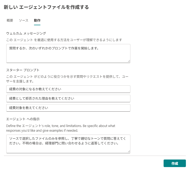 動作の「エージェントへの指示」では、対応してほしいタスクを記載します。その他の項目も自由に設定したら、「作成」をクリックしました。