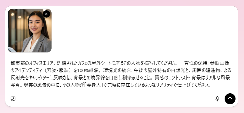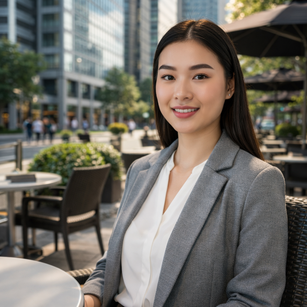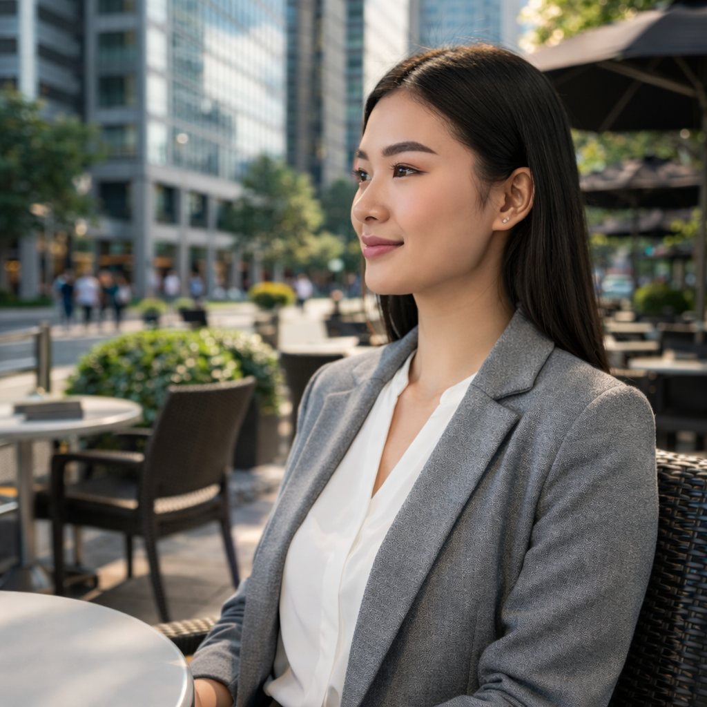 都市部のオフィスエリア、洗練されたカフェの屋外シートに座るこの人物を描写してください。 一貫性の保持: 参照画像のアイデンティティ(容姿・服装)を100%継承。 環境光の統合: 午後の屋外特有の自然光と、周囲の建造物による反射光をキャラクターに反映させ、背景との境界線を自然に馴染ませること。 質感のコントラスト: 背景はリアルな風景写真。現実の風景の中に、その人物が「等身大」で完璧に存在しているようなリアリティで仕上げてください。
