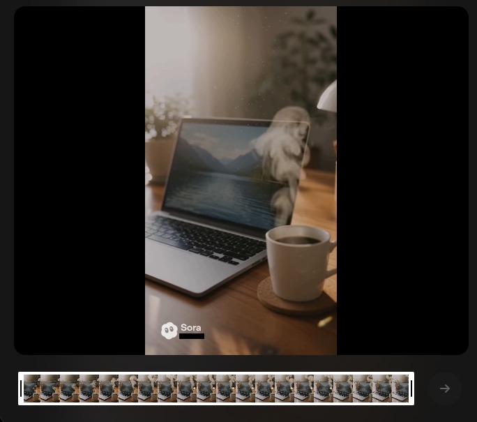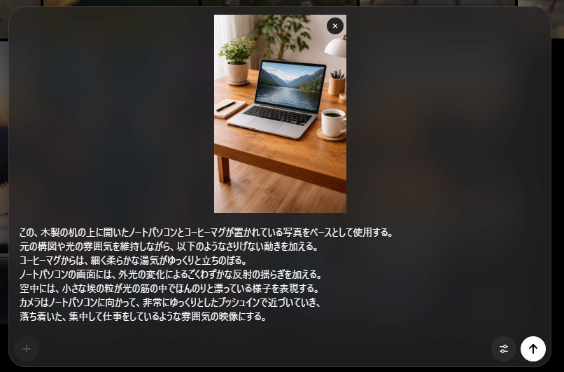 木製デスクに置かれたノートPCとマグカップの写真をベースとしてSoraに読み込ませ、そこに「環境の微細な変化」と「カメラワーク」を加える指示を出しました。