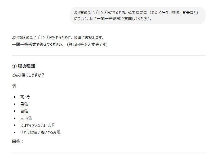 ChatGPTに対して「より質の高いプロンプトにするため、必要な要素(カメラワーク、照明、背景など)について、私に一問一答形式で質問してください」と指示を出します。