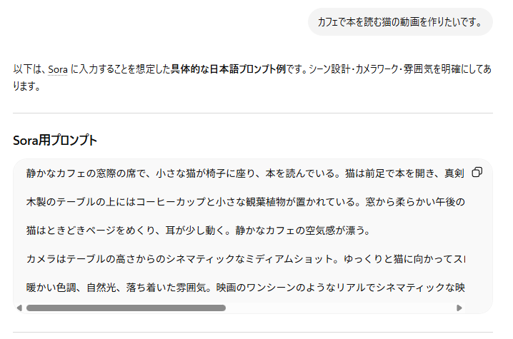 次に、「カフェで本を読む猫の動画を作りたいです」といったように、思い描いているざっくりとしたアイデアを伝えます。