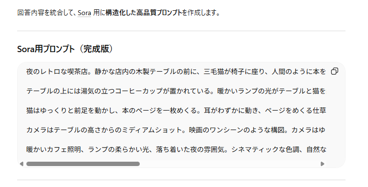 すべての質問に答え終わると、ChatGPTがそれらの情報を整理し、Soraの特性に合わせた詳細なプロンプトを自動で出力してくれます。必要に応じて「もっとシネマティックな雰囲気を強調して」などと微調整を依頼することも可能です。